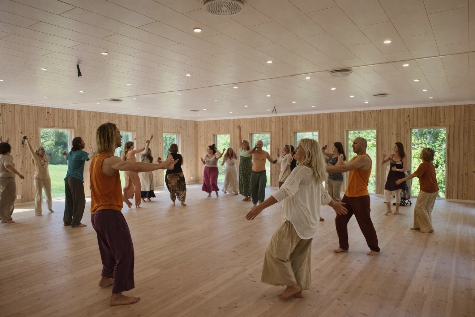 Här finns ljusa salar för meditation och gemensamt arbete, samt bastu, pool och naturnära miljöer som stödjer vila, återhämtning och fördjupning.